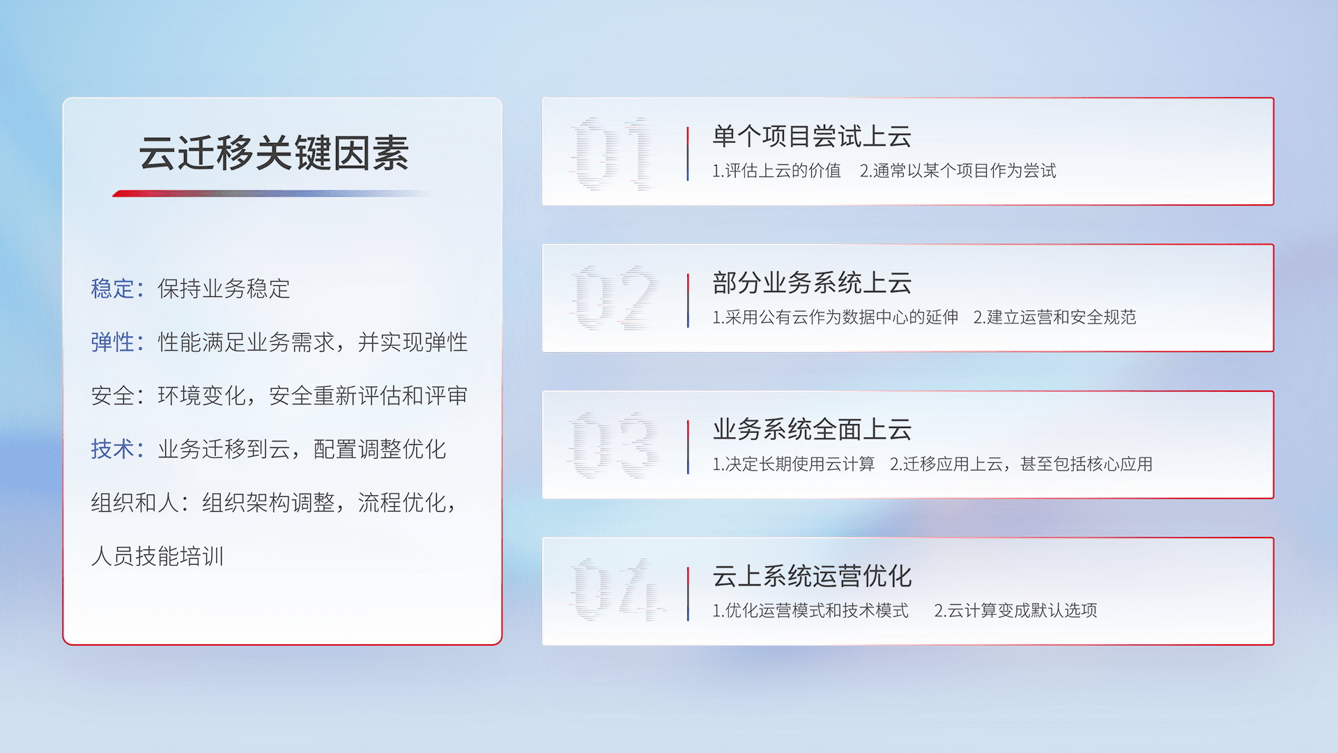结合实际业务,,,,从规划设计、、云平台选型、、、、云原生改造、、、、数据迁移、、集成交付,,,,迁移全过程为客户识别最佳上云路径,,做好风险识别管理,,设计网络架构、、身份权限、、、、安全审计合规、、、、操作审计、、日志审计、、、、监控告警策略、、、多站点容灾设计等,,,,对云上基础设施进行整体规划,,,提升IT治理水平,,,以满足弹性、、、高可用、、、、高性能的需求。。